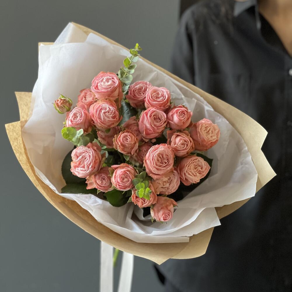 Розовые кустовые розы с эвкалиптом в крафтовой упаковке в Евпатории